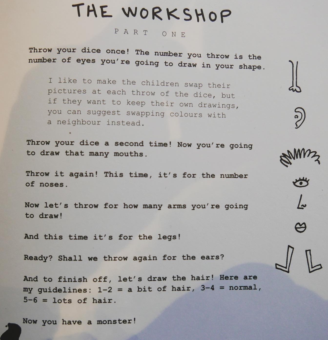 Today we have a game of monsters, dreamt up by the very wonderful artist and arts educator Herve Tullet. In this game, each artist needs some paper upon which have been drawn some shapes (maybe ask an adult to prepare some blobs, splats, ovals, etc. to help you get into the ‘anything goes’ mindset). Use a dice and take turns to roll… now follow Herve’s guidance to draw the features, swapping sheets in between each roll of the dice.